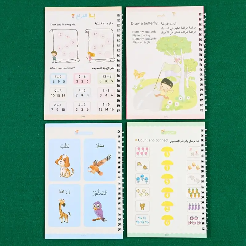 📖 4 كتب تعليمية تحتوي على أنشطة الحساب، الرسم، الأرقام، والحروف.